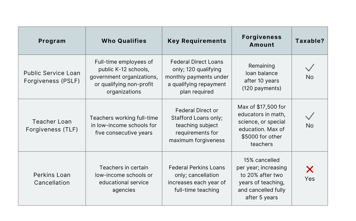 Managing student loan debt while making an impact as an educator can be challenging. Fortunately, there are federal programs that help teachers and public service employees reduce or eliminate student loan debt. Below is an overview of the most relevant programs for educators: